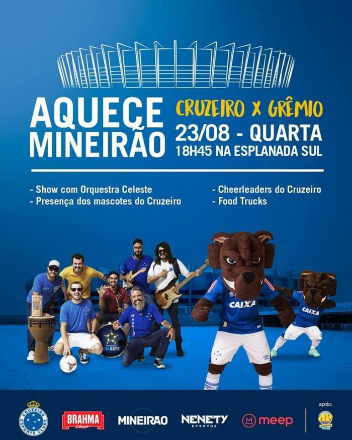 Aquece Mineirão chega para “esquentar” os torcedores antes do jogo Cruzeiro X Grêmio nesta quarta-feira Redacao 21 de agosto de 2017 Cultura, Notícias A Esplanada Sul do Mineirão receberá evento gratuito com food trucks, show com a Orquestra Celeste e presenças dos mascotes e das Cheerleaders do Cruzeiro Os torcedores contarão com uma novidade no Gigante da Pampulha. A Nenety Eventos, em parceria com o Mineirão, o time Cruzeiro, a Brahma e a Meep, realizará o Aquece Mineirão, evento com entrada franca que tem como objetivo ser um ponto de encontro para a família para saborear comidas e bebidas, além de curtir shows musicais antes e após os jogos. A primeira acontece na próxima quarta-feira, dia 23 de agosto, às 18h45, na Esplanada Sul do Mineirão, antes do jogo em que o Cruzeiro enfrentará o Grêmio pela Copa do Brasil. Antes do jogo, a Orquestra Celeste, os mascotes e as Cheerleaders do Cruzeiro colorirão de azul a Esplanada Sul do Mineirão em um evento direcionado para toda a família. Para acompanhar a animação, food trucks com comidas deliciosas além, é claro, de muita cerveja gelada. A entrada para o Aquece Mineirão é gratuita e o evento é aberto tanto para os torcedores que forem assistir ao jogo dentro do estádio, tanto para quem quiser confraternizar com a torcida, mas não necessariamente vá acompanhar a partida da arquibancada. Serviço Aquece Mineirão 23 de agosto, quarta-feira, 18h45 Atrações: show com a Orquestra Celeste e presenças dos mascotes e das Cheerleaders do Cruzeiro, além de food trucks Entrada franca Classificação etária: livre Realização: Nenety Eventos, Mineirão, Cruzeiro, Brahma e Meep comentários